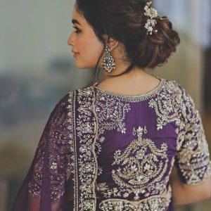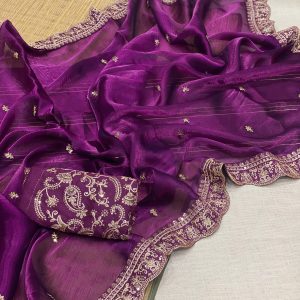 Step into elegance with this Deep Purple Jimichu satin saree featuring detailed embroidery, coding, and sequin accents. Includes unstitched Mono Banglori Silk blouse with rich front and back embroidery. Ideal for weddings, receptions, or celebrity-inspired events.