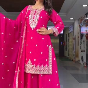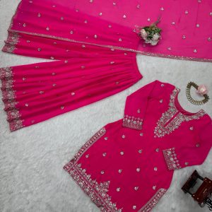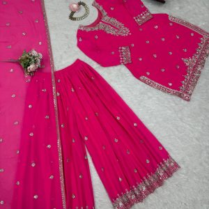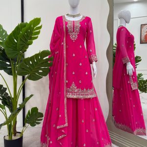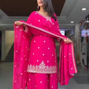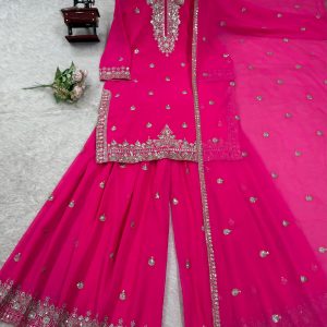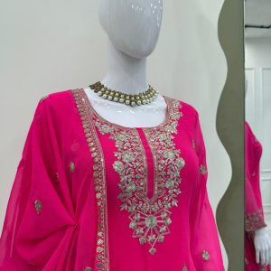 Step into elegance with our stunning 5000 Series Palazzo Suit Set. This vibrant hot pink ensemble is crafted from premium faux georgette and features intricate thread and sequin embroidery that elevates your ethnic wardrobe. The top comes with a micro inner lining and is stitched in sizes M (38), XL (42), and XXL (44) with 3XL margin. The matching palazzo is also fully stitched with elastic waist, fitting up to 44. Complete with a 2.2 meter dupatta adorned with thread work and a four-side lace border, this set is perfect for festive celebrations, weddings, and party occasions.