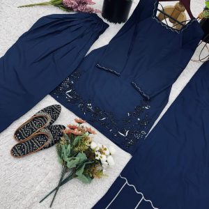 This fully stitched navy crepe-silk Farshi set is an ideal pick for festive and wedding wear. The top is adorned with intricate embroidery and sequin work, paired with a flowing bottom and elegant dupatta.