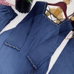 Indulge in graceful sophistication with our Elegant Navy Crepe‑Silk Farshi Set. Crafted from 100% natural crepe silk and intricately embellished with sequined embroidery, this ensemble offers:
